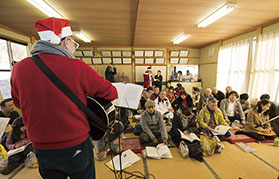 この3人が、仮設住宅集会所の倉庫に眠っていた3台のギターを発見し、「これで何か支援活動ができないか?」と考え2013年に始まったのが「歌声喫茶」。2014年からは東京から福島へ移住してきたミュージシャン野島健太郎をメンバーに迎えて、現在まで定期的に行なっています。